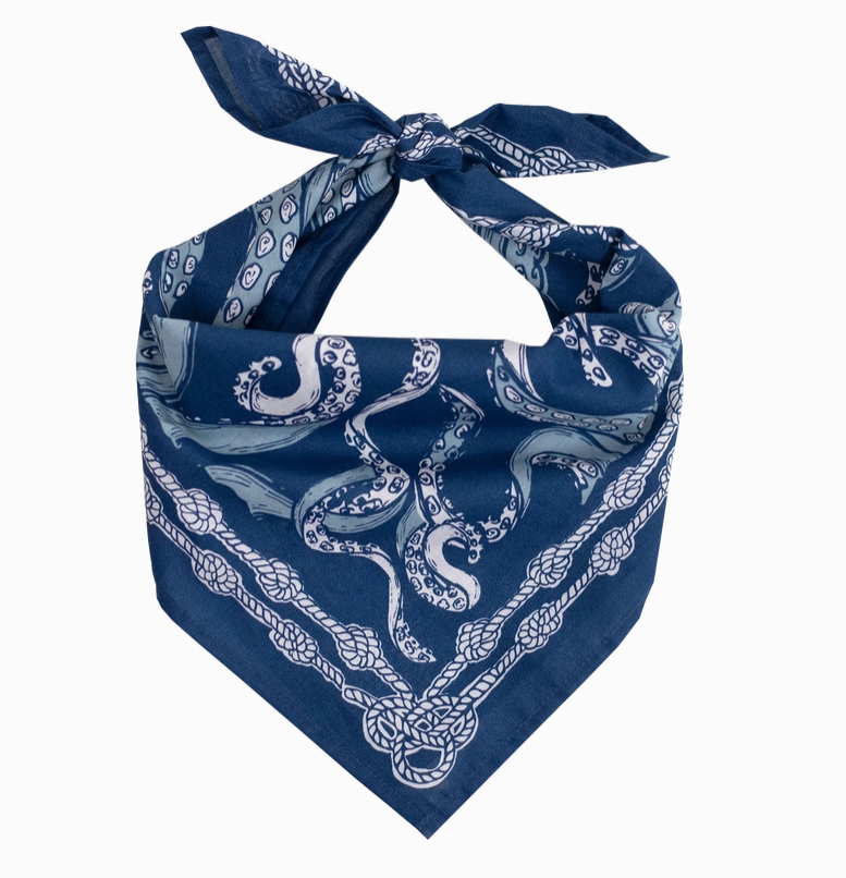 The Nautilus bandana is an original ocean & tentacle design in shades of blue. Silk screened by hand and made of premium cotton, this fun bandana can be used as a handkerchief, hair tie or headband, scarf, outfit accessory, and more.