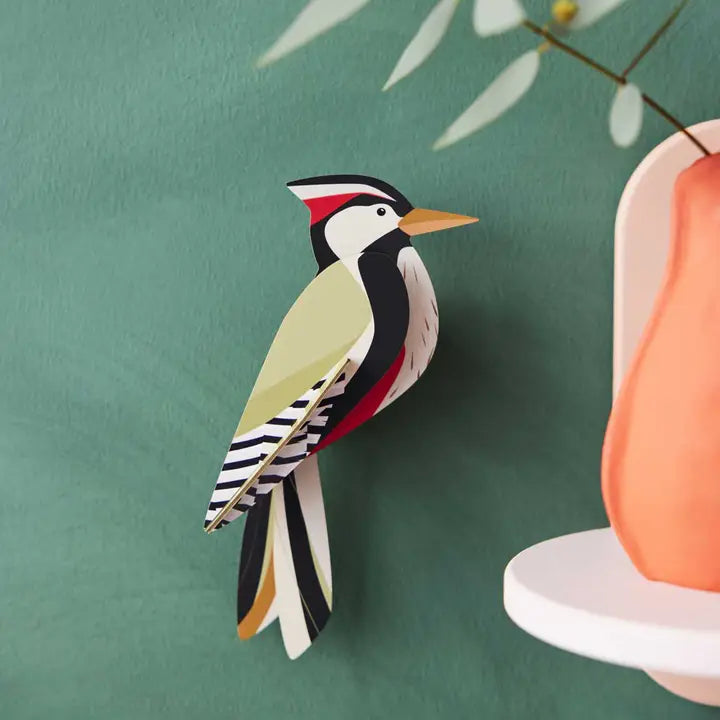 Garden birds chirp around us, pecking at some crumbs, glancing around, then fluttering away. They add color to our daily lives. This cardboard woodpecker won’t fly away and can be given a lovely spot on your wall.